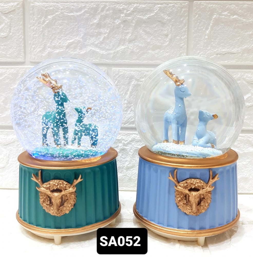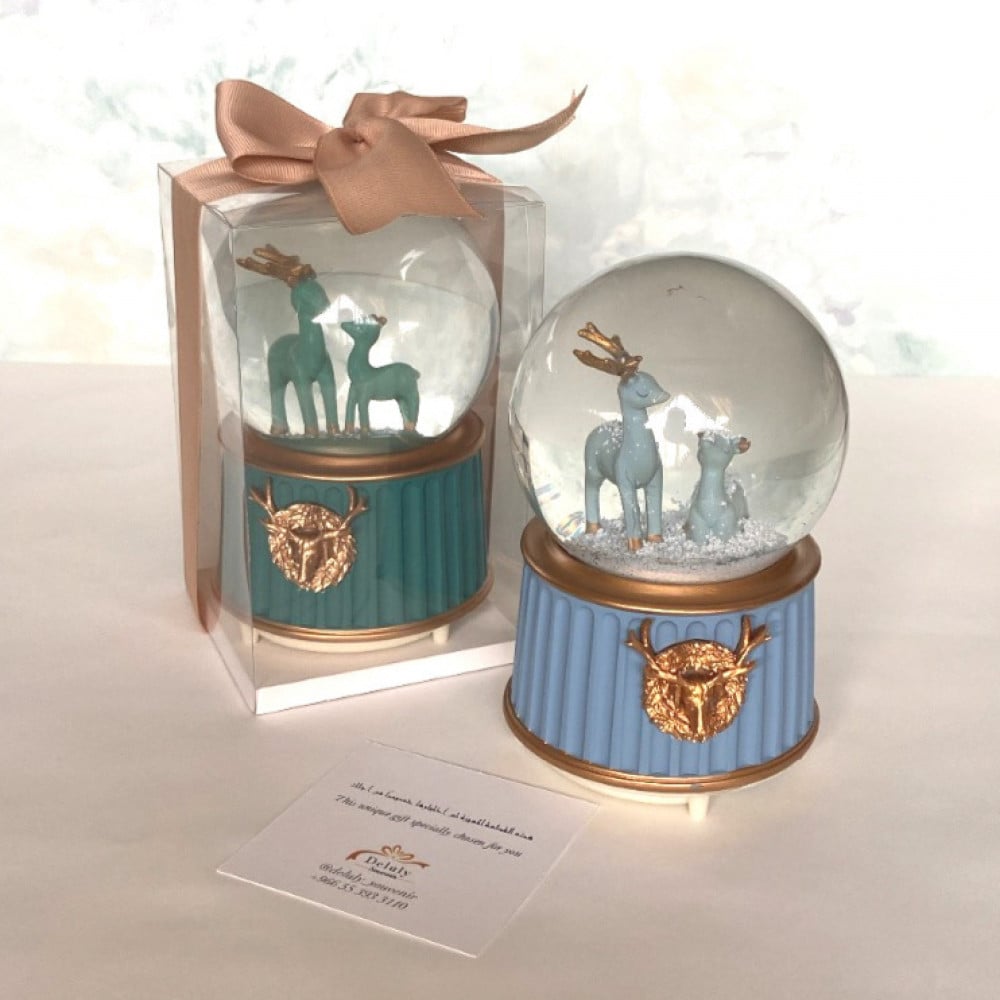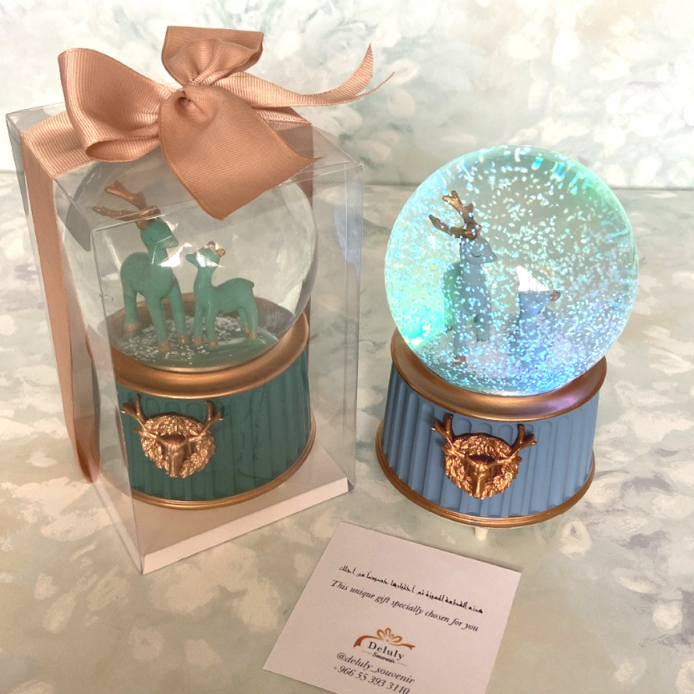 الكرة الثلجية الإلكترونية بثيم الغزال و بالطابع الأوروبي الراقي مع قاعدة بنقش ذهبي في علبه شفافه و شريطو كرت اهداء.